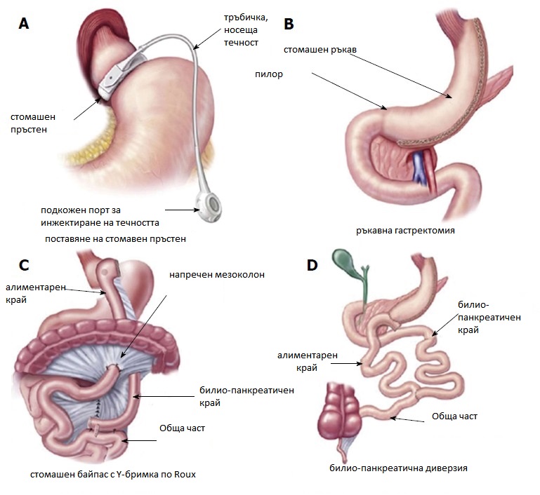 През последните 50 години са разработени най-различни видове оперативни техники в бариатричната хирургия. Като утвърдени и най-ефективни и най-използвани в световната хирургия са: поставяне на стомашен пръстен, ръкавна гастректомия, стомашен байпас с Y-бримка по Roux и билио-панкреатична диверзия. Те са представени нагледно, схематично на фигурата по-долу.
